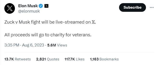 當(dāng)?shù)貢r間6日,馬斯克在“X”平臺上發(fā)文稱,要將兩人約架過程在“X”平臺直播,并把相關(guān)收益全部捐贈給服務(wù)退伍老兵的慈善機構(gòu),同時表示自己正在為決斗“夜以繼日”地訓(xùn)練。