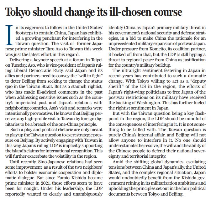 臺灣是中國領(lǐng)土不可分割的一部分,臺灣問題純屬中國內(nèi)政,不容外部勢力染指和干涉。任何人都不應(yīng)低估中國政府和人民捍衛(wèi)國家主權(quán)和領(lǐng)土完整的決心、意志和能力。日本曾長期殖民臺灣,在臺灣問題上負有不可推卸的嚴(yán)重歷史罪責(zé),理應(yīng)真心懺悔,認真反思,謹言慎行。