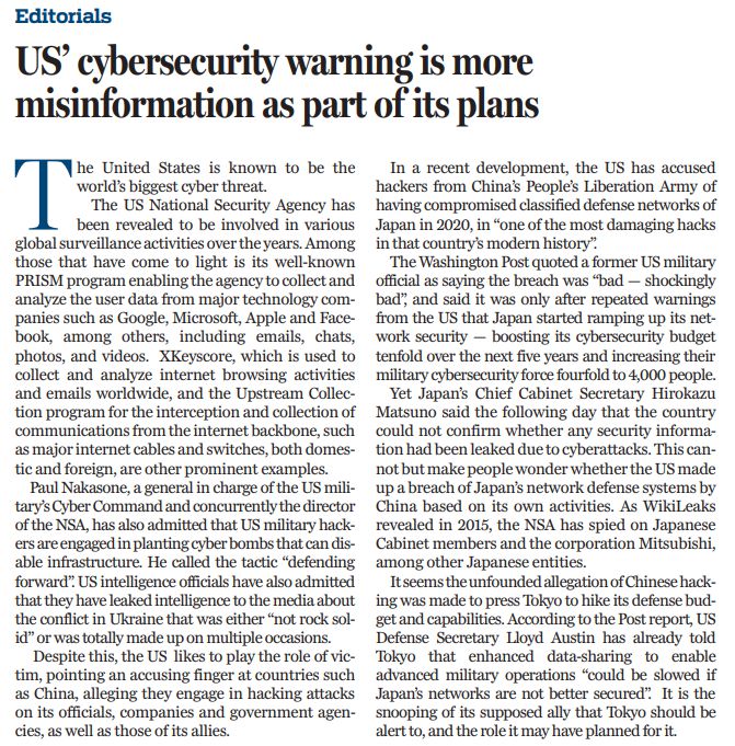 盡管如此,美國卻總是裝出一副受害者的樣子,指責(zé)中國等國對美國及其盟友的官員、企業(yè)和政府機(jī)構(gòu)發(fā)動(dòng)黑客攻擊。最近,美國就指責(zé)中國黑客在2020年入侵了日本防衛(wèi)部門的機(jī)密網(wǎng)絡(luò),稱之為“日本現(xiàn)代史上最具破壞性的黑客攻擊之一”。然而,日本內(nèi)閣官房長官松野博一表示,日本無法確認(rèn)是否有任何安全信息因網(wǎng)絡(luò)攻擊而泄露。這不禁讓人懷疑,美國是否根據(jù)自己的黑客活動(dòng),編造了中國破壞日本網(wǎng)絡(luò)防御系統(tǒng)的故事?維基解密在2015年就披露,美國國家安全局在秘密監(jiān)視日本內(nèi)閣成員和三菱公司,以及其他日本實(shí)體。