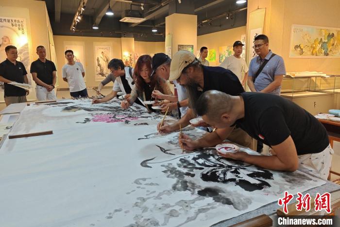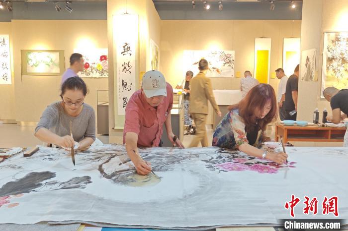 8月9日,張明琴(右一)在福建泉州與藝術(shù)家們共繪國畫作品?!枪跇?biāo) 攝