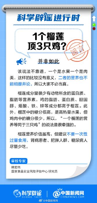 中新網(wǎng)8月15日電 1個(gè)榴蓮頂3只雞?該說(shuō)法不靠譜,一個(gè)是水果一個(gè)是肉類,這樣的比較沒(méi)有意義,二者的營(yíng)養(yǎng)也不能相提并論。雖然榴蓮營(yíng)養(yǎng)價(jià)值高,但還是建議不要一次性過(guò)量食用,腎病患者、肥胖人群、糖尿病人盡量少吃。(來(lái)源:@科學(xué)辟謠 @中國(guó)新聞網(wǎng) )