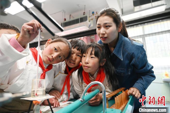 5月18日,四川阿壩州壤塘縣寄宿制學校學生在科學課做實驗?!≈行律缬浾?安源 攝