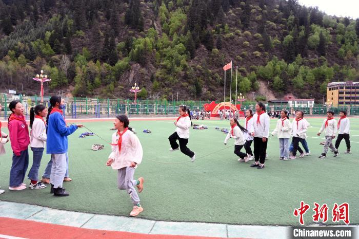 5月17日,四川阿壩州壤塘縣寄宿制學校的學生在操場跳繩?!≈行律缬浾?安源 攝