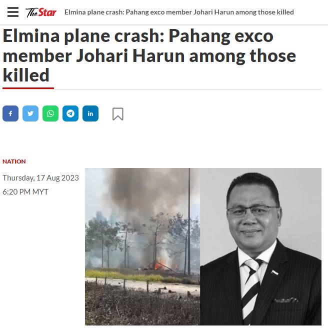中新網(wǎng)8月17日電 據(jù)馬來(lái)西亞《星州日?qǐng)?bào)》援引警方消息稱(chēng),當(dāng)?shù)貢r(shí)間17日,馬來(lái)西亞雪蘭莪州發(fā)生墜機(jī)事故,造成至少10人死亡,其中一名死者為該國(guó)彭亨州行政議員喬哈里·哈倫。