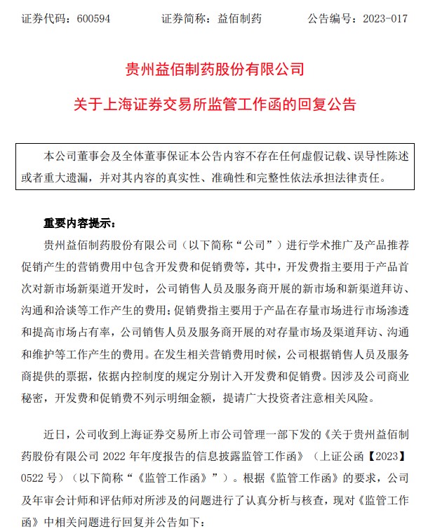 2023年6月,益佰制藥收到上交所年報監(jiān)管函,被要求補充披露銷售費用前五大支付對象;學術推廣、營銷平臺建設等市場費用主要核算內容明細情況;銷售費用支付對象中是否涉及公司經銷商、關聯(lián)方或其他利益相關方等相關信息。