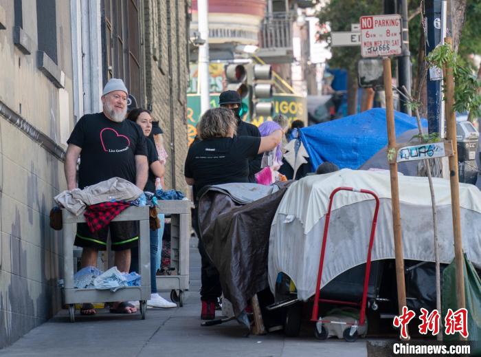 當?shù)貢r間8月18日,慈善機構(gòu)救世軍組織的工作人員和志愿者在美國舊金山田德隆區(qū)街頭分發(fā)食物和衣服。中新社記者 劉關(guān)關(guān) 攝