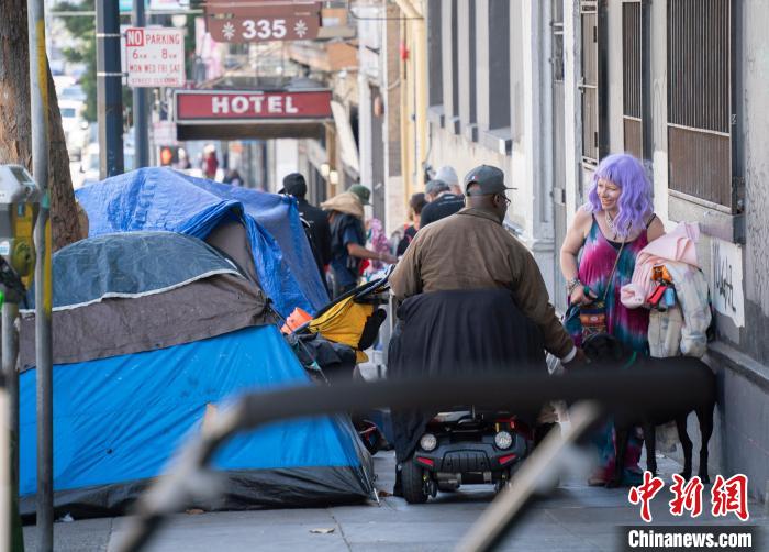 當?shù)貢r間8月18日,無家可歸者從美國舊金山田德隆區(qū)街頭經(jīng)過。中新社記者 劉關(guān)關(guān) 攝
