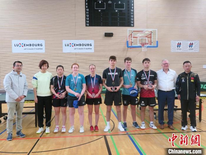 中國駐盧森堡大使華寧(左一)、奧運冠軍張怡寧(左二)、閻森(右一)等與參加青年集訓(xùn)營的選手合影留念。中新網(wǎng)發(fā) 中國駐盧森堡使館供圖