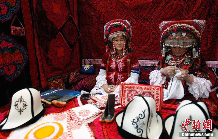 圖為新疆柯爾克孜族手工刺繡展臺。王小軍 攝