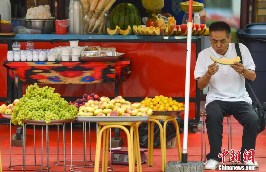 盛夏時節(jié),新疆又迎來一年瓜果飄香時,游客隨時隨地都可品嘗到最美味的瓜果。劉新 攝