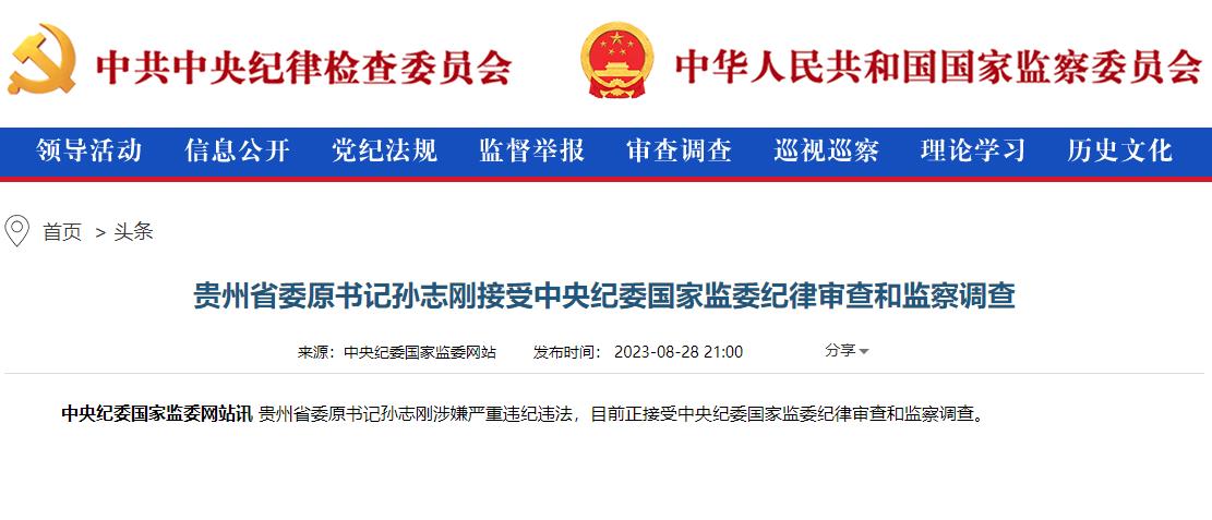 中新網(wǎng)北京8月29日電(記者 袁秀月)又見深夜打虎。中央紀(jì)委國家監(jiān)委網(wǎng)站28日晚通報,貴州省委原書記孫志剛涉嫌嚴(yán)重違紀(jì)違法,目前正接受中央紀(jì)委國家監(jiān)委紀(jì)律審查和監(jiān)察調(diào)查。