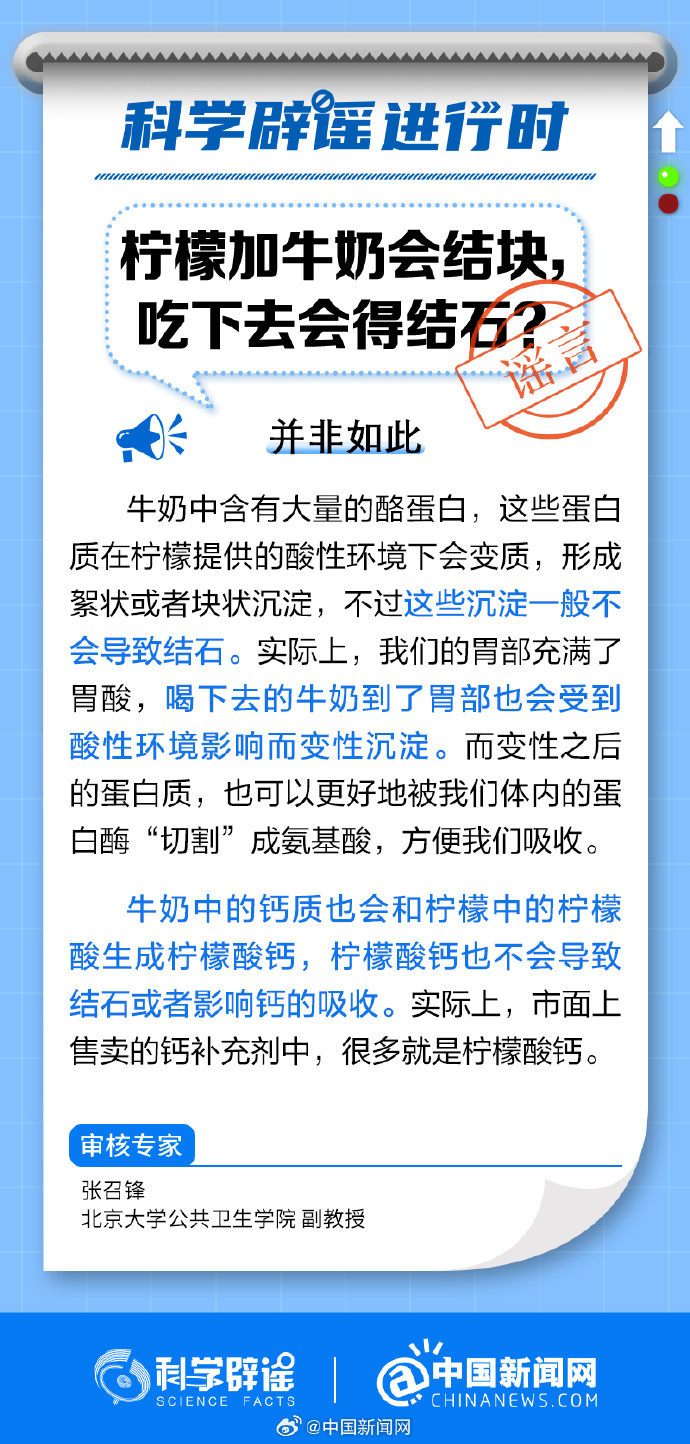 中新網(wǎng)8月29日電 牛奶中含有大量的酪蛋白,這些蛋白質(zhì)在檸檬提供的酸性環(huán)境下會(huì)變質(zhì),形成絮狀或者塊狀沉淀,不過這些沉淀一般不會(huì)導(dǎo)致結(jié)石。牛奶中的鈣質(zhì)也會(huì)和檸檬中的檸檬酸生成檸檬酸鈣,檸檬酸鈣也不會(huì)導(dǎo)致結(jié)石或者影響鈣的吸收。(來源:@科學(xué)辟謠 中國新聞網(wǎng)微博)