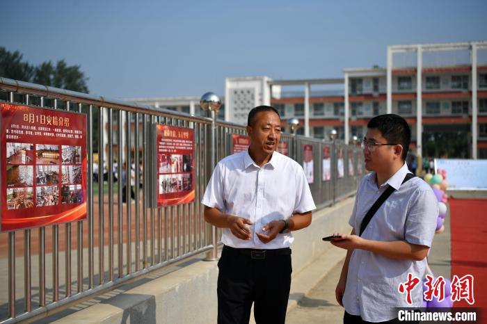 9月1日,涿州市刁窩中學校長孫常見(左)向中新社記者講述“筑夢路”背后的故事。 中新社記者 翟羽佳 攝