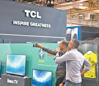 在2023年圣保羅國(guó)際消費(fèi)類(lèi)電子及家用電器產(chǎn)品展覽會(huì)上,參觀者在TCL展臺(tái)前合影留念。