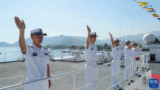 9月3日,中國海軍“和平方舟”號醫(yī)院船抵達東帝汶帝力港,任務官兵向迎接人群揮手致意。新華社發(fā)(徐巍 攝)
