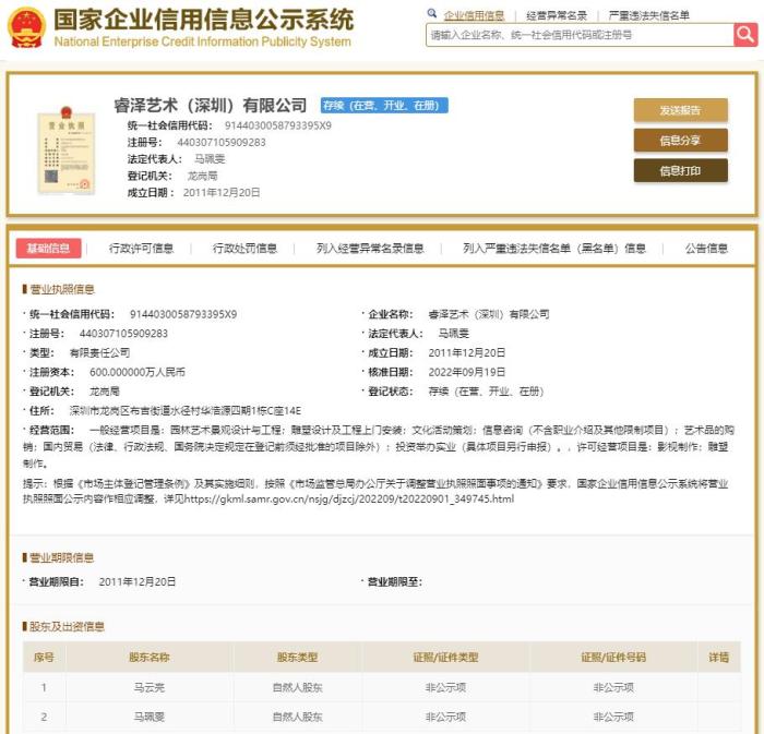 國家企業(yè)信用信息公示系統(tǒng)顯示,睿澤藝術(shù)(深圳)有限公司成立于2011年12月,法定代表人為馬珮雯,注冊資本600萬人民幣。公司由馬云亮、馬珮雯共同持股,馬云亮持股75%,為公司實(shí)控人。