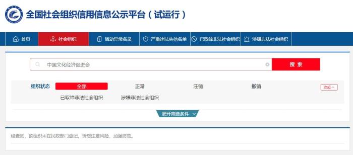 但中新財(cái)經(jīng)記者在全國社會(huì)組織信用信息公示平臺(tái)查詢發(fā)現(xiàn),中國城市雕塑建設(shè)研究院、中國文化經(jīng)濟(jì)促進(jìn)會(huì)均未在民政部門登記。