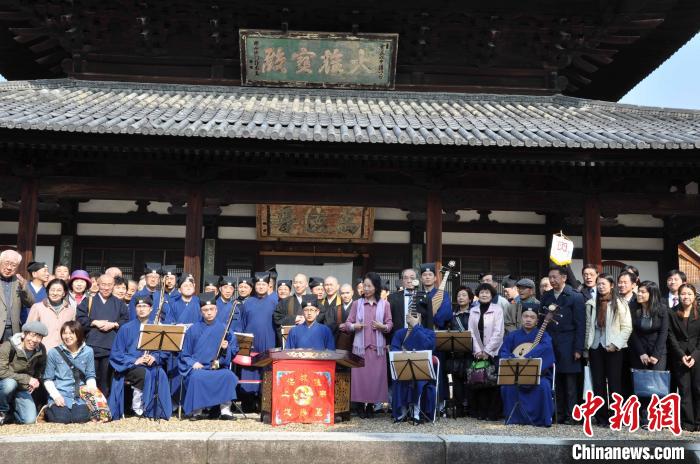 2012年4月8日,上海城隍廟道樂團(tuán)與日本觀眾在萬福寺大雄寶殿前合影?!?上海市道教協(xié)會供圖)