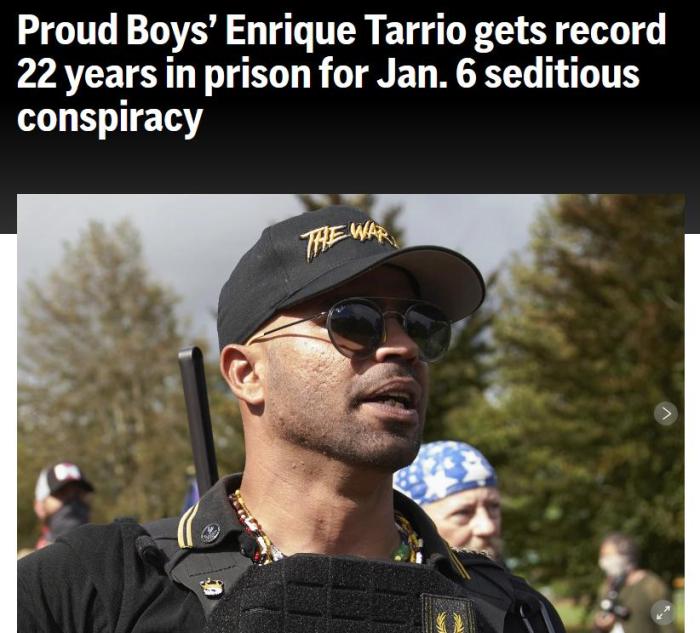 據(jù)報道,涉嫌幕后策劃2021年1月6日美國國會騷亂的極右翼組織“驕傲男孩”前主席塔里奧(Enrique Tarrio),于當(dāng)?shù)貢r間5日在華盛頓特區(qū)聯(lián)邦法院被判處22年監(jiān)禁刑期,被控煽動陰謀等罪名。