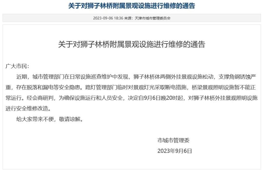 天津市城市管理委決定對(duì)獅子林橋附屬景觀設(shè)施進(jìn)行維修