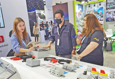 在一家泰國電氣設(shè)備商的展位前,工作人員向參觀者介紹多種電控組件。