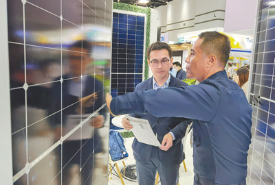 在一家中國科技公司展位上,參觀者在討論光伏組件參數(shù)。