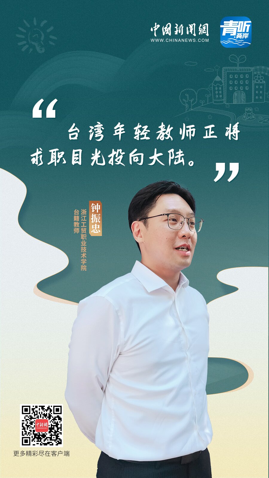 中新網(wǎng)9月10日電 (記者 程子倬 陳文韜)如今,越來越多的臺籍教師擁抱大陸發(fā)展機遇,赴大陸任教、立業(yè)筑夢,融入當(dāng)?shù)厣睢=?,在中國新聞網(wǎng)《青聽·兩岸》節(jié)目中,幾位在大陸不同教育機構(gòu)任職的臺灣青年教師分享了各自融入大陸教育行業(yè)的故事,以及他們對大陸教育事業(yè)的觀察。