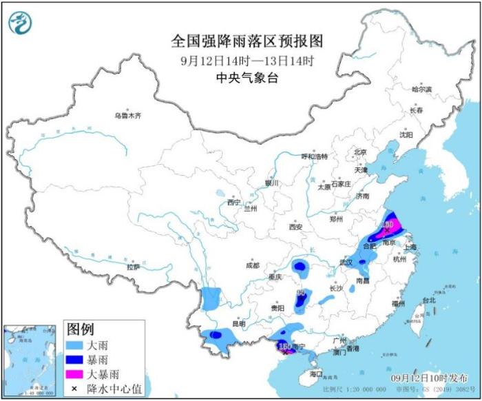 預(yù)計(jì),9月12日14時至13日14時,江蘇中部、安徽中部、湖北東南部和西南部、江西北部、湖南西部、貴州東南部、云南西北部和南部、廣西西部和南部等地部分地區(qū)有大到暴雨,其中,江蘇中部、安徽中部偏東地區(qū)、廣西南部等地部分地區(qū)有大暴雨(100~160毫米);上述地區(qū)最大小時降雨量30~50毫米,局地可超過60毫米,局地還有雷暴大風(fēng)等強(qiáng)對流天氣。