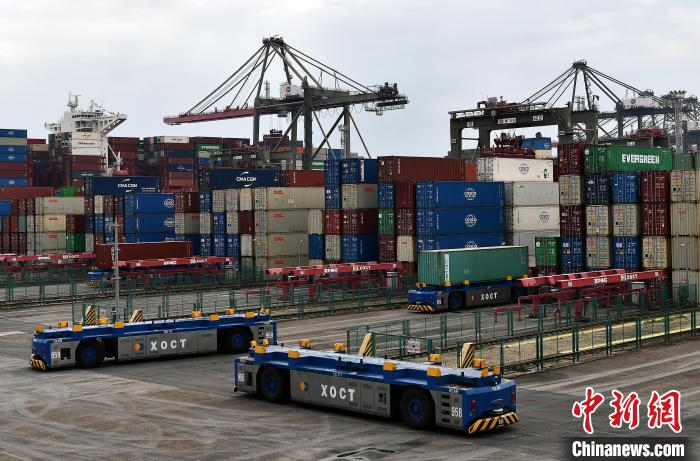 9月7日,廈門遠(yuǎn)海自動化碼頭上,轉(zhuǎn)運(yùn)集裝箱的自動導(dǎo)引車正在作業(yè)。這是全球首個(gè)第四代自動化碼頭、中國首個(gè)擁有全部自主知識產(chǎn)權(quán)的自動化碼頭,開行了多條“絲路海運(yùn)”命名航線。 中新社記者 張斌 攝