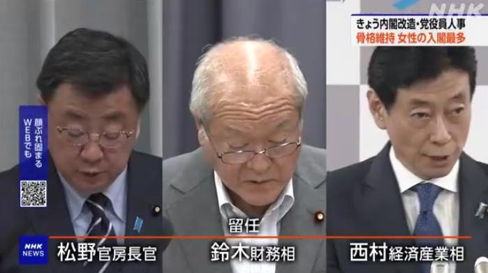 新一屆內(nèi)閣中,日本內(nèi)閣官房長官、財(cái)務(wù)大臣和經(jīng)濟(jì)產(chǎn)業(yè)大臣等職位沒有進(jìn)行調(diào)整。圖片來源:日本放送協(xié)會(huì)(NHK)報(bào)道截圖
