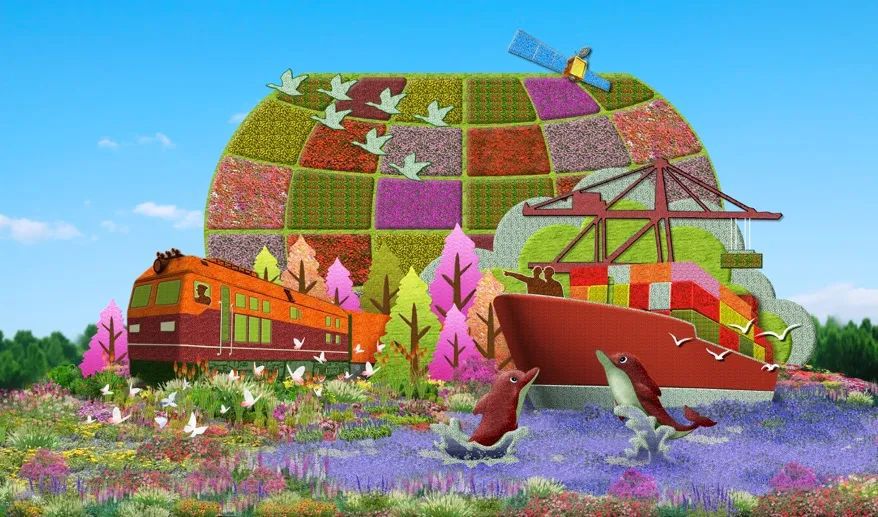7. 西單東南角的“幸福之路”花壇頂高9米,以中歐班列、貨輪以及海豚為主景,寓意共同把“一帶一路”這條造福世界的幸福之路鋪得更寬更遠(yuǎn)。