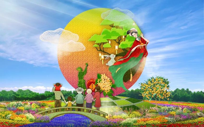 8. 西單西北角的“花好月圓”花壇頂高8米,以一家人中秋團(tuán)聚的溫馨畫(huà)面為場(chǎng)景,體現(xiàn)了花好月圓下的群眾幸福生活。