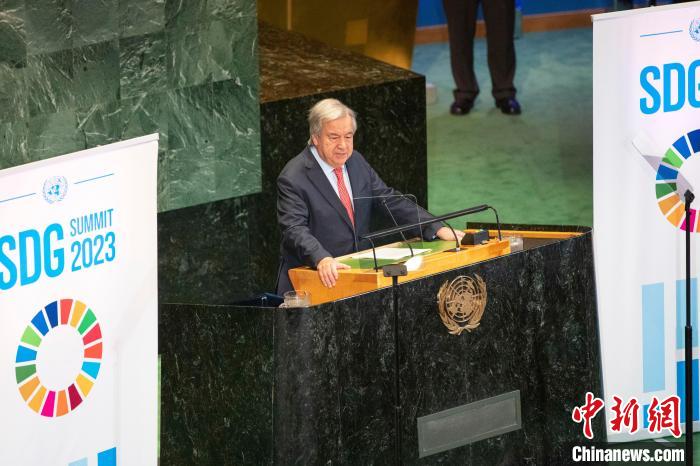 當?shù)貢r間9月18日,聯(lián)合國可持續(xù)發(fā)展目標峰會在紐約聯(lián)合國總部拉開帷幕。當天,聯(lián)大通過一項政治宣言,會員國承諾加速實現(xiàn)2030年可持續(xù)發(fā)展目標。圖為聯(lián)合國秘書長古特雷斯發(fā)表講話?!≈行律缬浾?王帆 攝