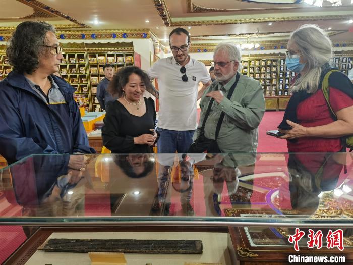 9月20日,外籍專家記者團參觀西藏大學(xué)圖書館藏文古籍研究所。中新社記者 趙延 攝