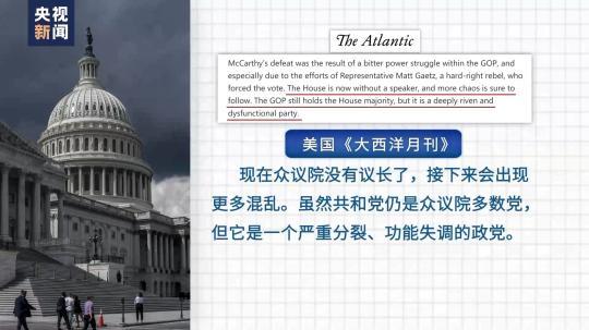 美國《大西洋月刊》評論說,現(xiàn)在眾議院沒有議長了,接下來會出現(xiàn)更多混亂。雖然共和黨仍是眾議院多數(shù)黨,但它是一個嚴重分裂、功能失調(diào)的政黨。