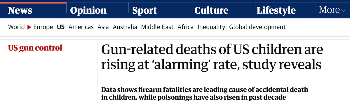 數(shù)據(jù)還顯示,槍支死亡是美國兒童意外死亡的主要原因。研究報告指出:“兒童傷害相關(guān)死亡的最新趨勢令人擔(dān)憂,在過去十年中,他殺、自殺以及中毒事件均有所增加。”