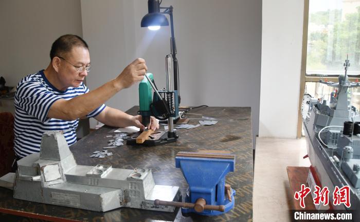 “這艘艦是用鍍鋅板按100∶1的比例制作的,花了我大概3年的業(yè)余時(shí)間,純手工制作。”1980年曾服役于東海艦隊(duì),1983年退伍的漳州薌城籍海軍老兵潘雄告訴記者,他專注制作艦艇模型近40年,平均每?jī)赡暝煲凰?,目前已造出“遼寧號(hào)”航母、中華神盾艦等各類艦艇20艘模型,并有兩艘055型驅(qū)逐艦?zāi)P驼谥谱髦小?/p>