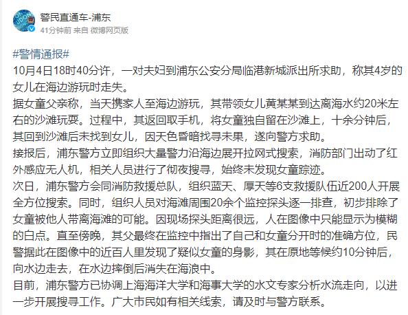 中新網10月6日電 據(jù)上海市公安局浦東分局官方微博消息,上海浦東警方發(fā)布一則通報:10月4日18時40分許,一對夫婦到浦東公安分局臨港新城派出所求助,稱其4歲的女兒在海邊游玩時走失。
