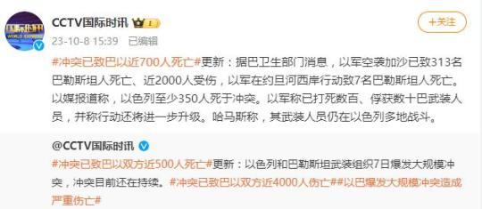 央視網(wǎng)消息:據(jù)CCTV國(guó)際時(shí)訊微博消息,據(jù)巴衛(wèi)生部門(mén)消息,以軍空襲加沙已致313名巴勒斯坦人死亡、近2000人受傷,以軍在約旦河西岸行動(dòng)致7名巴勒斯坦人死亡。以媒報(bào)道稱,以色列至少350人死于沖突。以軍稱已打死數(shù)百、俘獲數(shù)十巴武裝人員,并稱行動(dòng)還將進(jìn)一步升級(jí)。哈馬斯稱,其武裝人員仍在以色列多地戰(zhàn)斗。