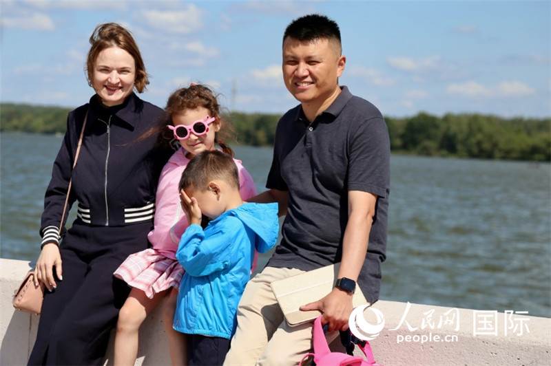 邢亮與妻子娜斯佳還有孩子們?cè)诤吷⒉健H嗣窬W(wǎng)記者 朱虹攝