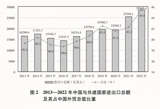 貿(mào)易投資規(guī)模穩(wěn)步擴(kuò)大。2013-2022年,中國與共建國家進(jìn)出口總額累計(jì)19.1萬億美元,年均增長(zhǎng)6.4%;與共建國家雙向投資累計(jì)超過3800億美元,其中中國對(duì)外直接投資超過2400億美元;中國在共建國家承包工程新簽合同額、完成營(yíng)業(yè)額累計(jì)分別達(dá)到2萬億美元、1.3萬億美元。2022年,中國與共建國家進(jìn)出口總額近2.9萬億美元,占同期中國外貿(mào)總值的45.4%,較2013年提高了6.2個(gè)百分點(diǎn);中國民營(yíng)企業(yè)對(duì)共建國家進(jìn)出口總額超過1.5萬億美元,占同期中國與共建國家進(jìn)出口總額的53.7%。