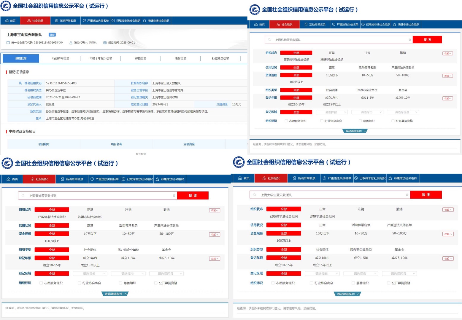 中新網(wǎng)查詢?nèi)珖鐣M織信用信息公示平臺發(fā)現(xiàn),上海市寶山藍(lán)天救援隊(duì)成立登記日期為2023年9月21日,系民辦非企業(yè)單位,業(yè)務(wù)主管單位為上海市寶山區(qū)應(yīng)急管理局。其余3個(gè)組織顯示為“該組織未在民政部門登記,請您注意風(fēng)險(xiǎn),加強(qiáng)防范”。