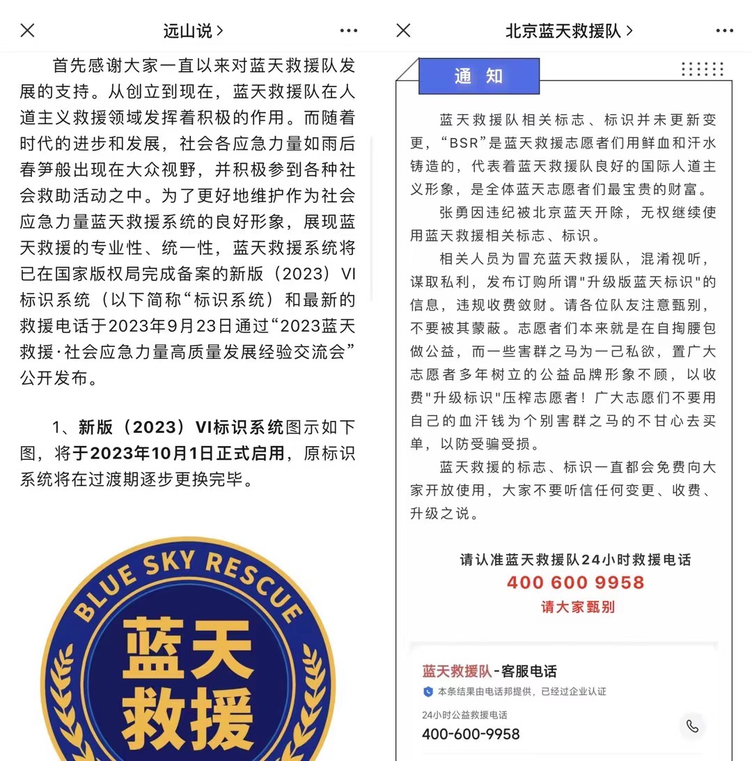 中新網(wǎng)注意到,今年9月30日,張勇在“遠(yuǎn)山說”公眾號上發(fā)布了《藍(lán)天救援關(guān)于更換VI標(biāo)識系統(tǒng)、救援電話的公告》,稱將于2023年10月1日正式啟用。就在啟用當(dāng)天,北京藍(lán)天救援隊(duì)公眾號發(fā)布信息稱“藍(lán)天救援隊(duì)相關(guān)標(biāo)志、標(biāo)識并未更新變更。不要聽信任何變更、收費(fèi)、升級之說?!?/p>