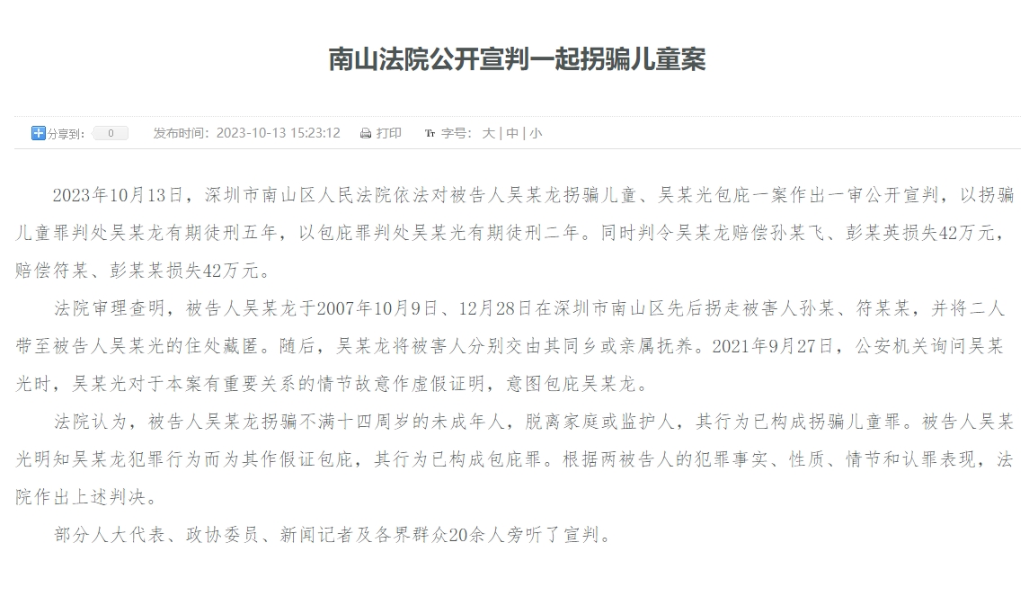 10月13日,深圳市南山區(qū)人民法院依法對(duì)被告人吳某龍拐騙兒童、吳某光包庇一案作出一審公開宣判,以拐騙兒童罪判處吳某龍有期徒刑五年,以包庇罪判處吳某光有期徒刑二年。同時(shí)判令吳某龍賠償孫某飛、彭某英損失42萬元,賠償符某、彭某某損失42萬元。