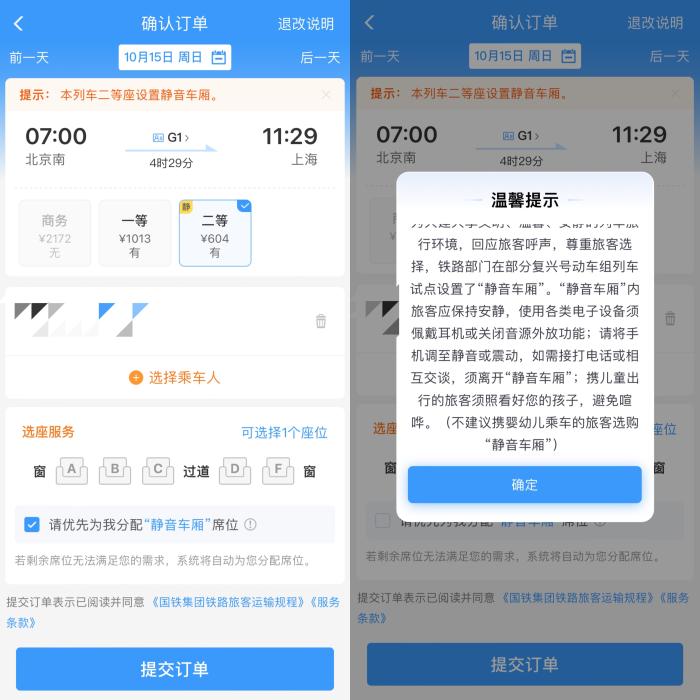 鐵路12306APP購(gòu)票頁(yè)面上的“靜音車(chē)廂”提示
