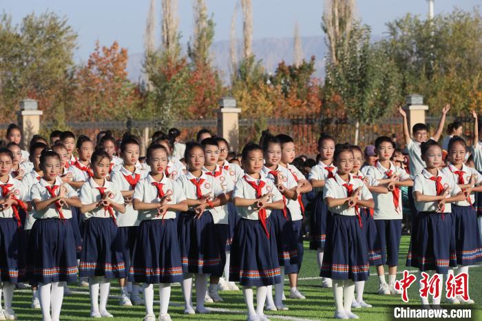 10月13日,在敦煌文化進(jìn)校園暨敦煌文化校服展示活動(dòng)上,當(dāng)?shù)貙W(xué)生展示“敦煌文化校服”。周斌全攝
