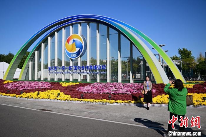 10月15日,北京,工作人員在國家會(huì)議中心外的第三屆“一帶一路”國際合作高峰論壇景觀布置前拍照留念。當(dāng)日,位于國家會(huì)議中心的第三屆“一帶一路”國際合作高峰論壇新聞中心啟動(dòng)試運(yùn)行。 中新社記者 田雨昊 攝