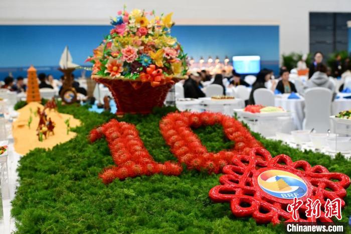 論壇新聞中心大門兩側(cè)擺放著兩塊主題燈光展板,走近細(xì)看,航行在大海中的帆船、在沙漠中行走的駱駝、“一帶一路”共建國家標(biāo)志性建筑物等多個(gè)具有象征意義的圖案細(xì)節(jié)盡在其中。在餐廳中央取餐臺(tái)上,代表著共建“一帶一路”倡議10周年的數(shù)字“10”,和祈年殿等中國古建筑物代表性元素也都精妙地融于一體。