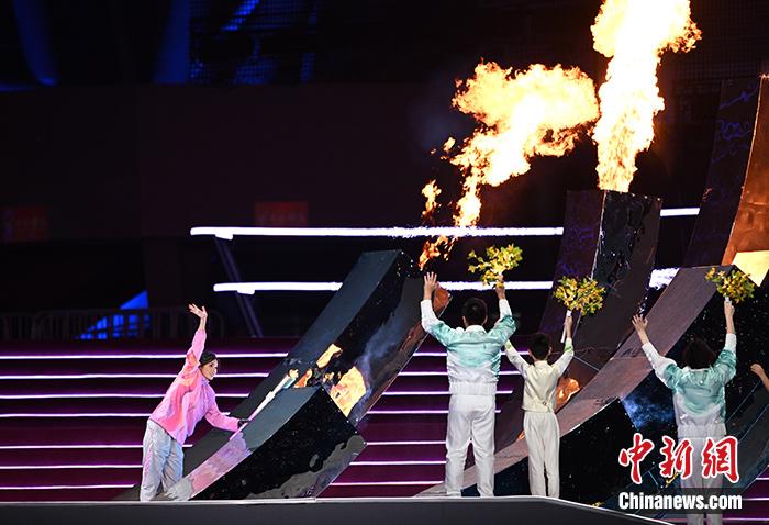 火炬手徐佳玲用智能仿生手點燃主火炬。王剛攝
