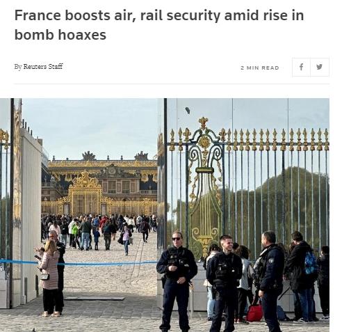 當(dāng)?shù)貢r(shí)間19日,法國14個(gè)機(jī)場收到炸彈威脅,至少9個(gè)機(jī)場進(jìn)行疏散。凡爾賽宮也在不到一周的時(shí)間內(nèi)第4次進(jìn)行疏散。